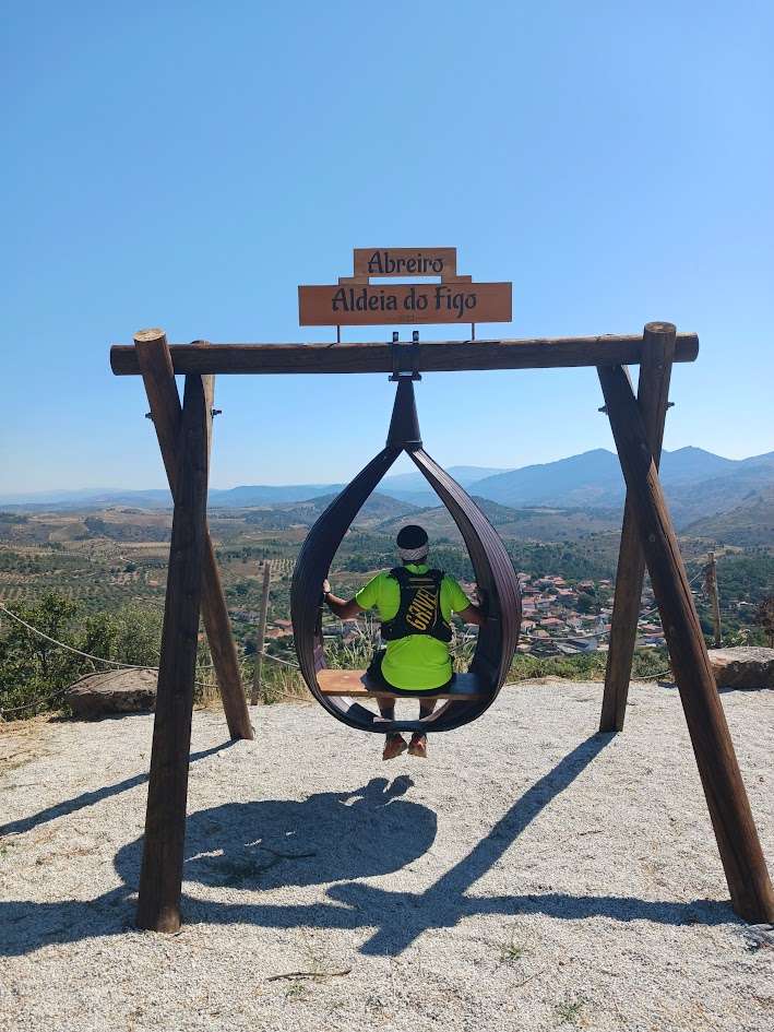 Ao chegar, encontramos um baloiço com forma de figo: o baloiço da aldeia de Abreiro, em que o figo é fonte de rendimento e emblema de tradições. O baloiço disponibiliza uma vista panorâmica sobre as montanhas e o novelo de telhados que compõe a freguesia de Abreiro. Oferece também as memórias, cravadas em ruínas, de uma antiga capela que se vai desmoronado como castelos de sonhos e projetos que ficam por concretizar.