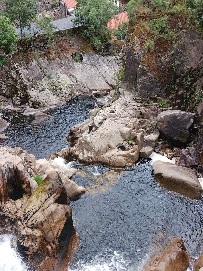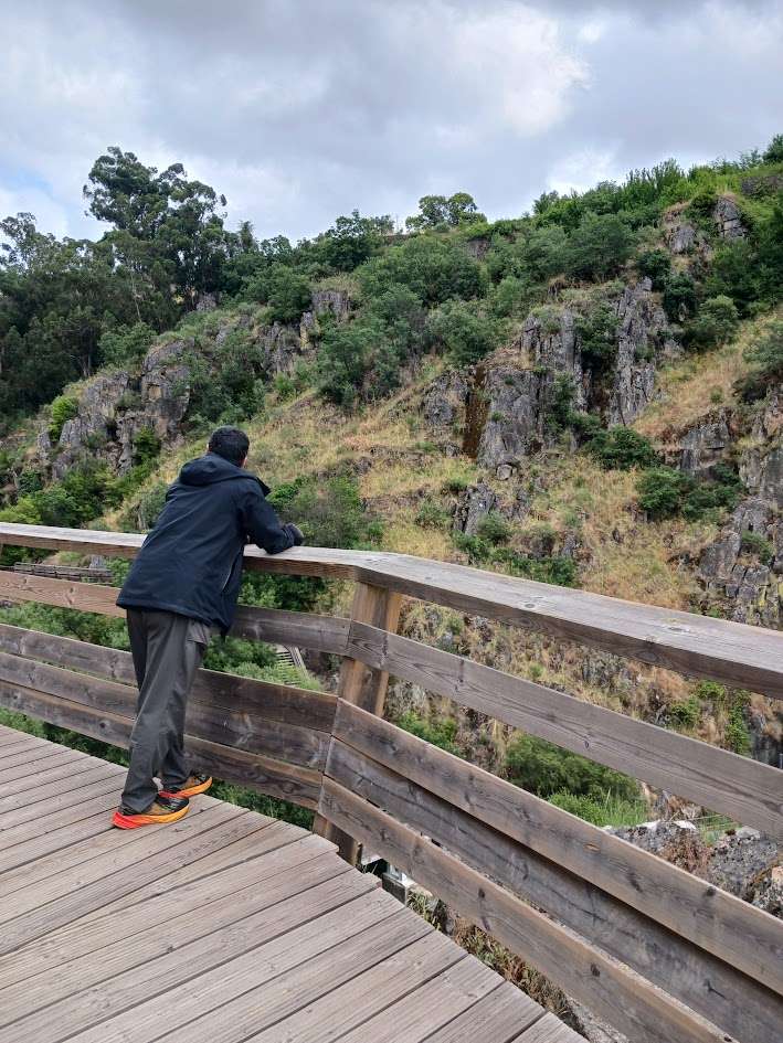 Atravessada uma porta colorida que só permite a passagem de almas estreitas, a vista mergulha nas águas verde-garrafa do Corgo que deslizam por balizas de granito. Entramos, então, nos passadiços que se desdobram em 750 de tábuas de madeira, que tão depressa descem como se erguem em degraus com apoio, convidativos à contemplação.