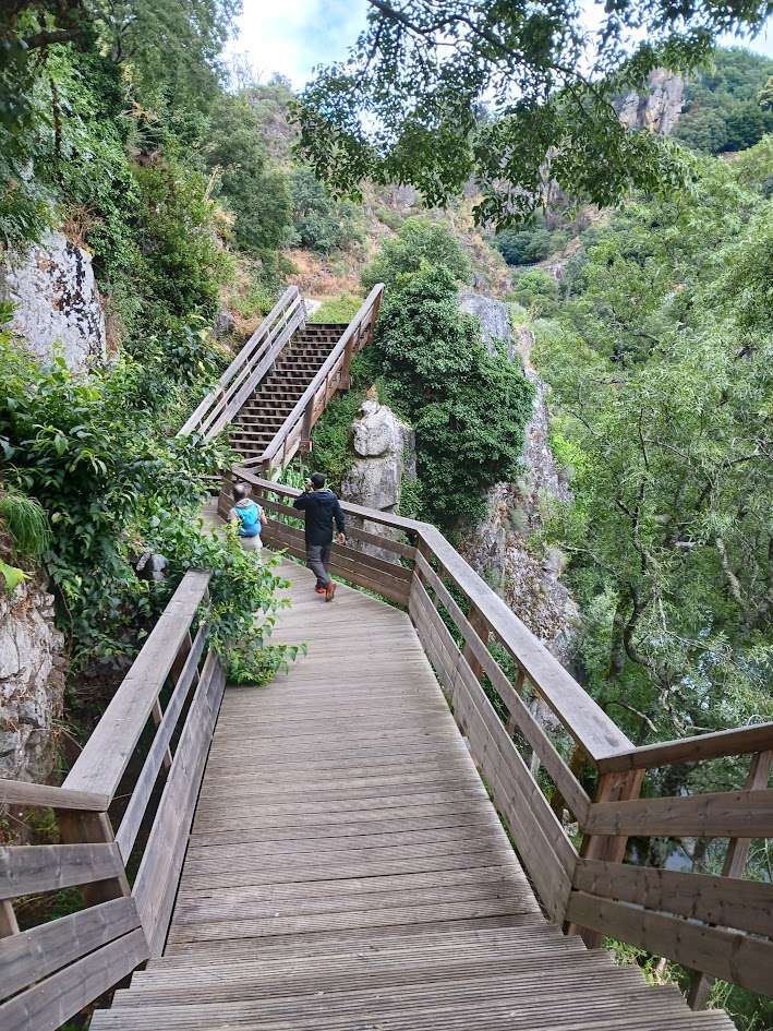 Atravessada uma porta colorida que só permite a passagem de almas estreitas, a vista mergulha nas águas verde-garrafa do Corgo que deslizam por balizas de granito. Entramos, então, nos passadiços que se desdobram em 750 de tábuas de madeira, que tão depressa descem como se erguem em degraus com apoio, convidativos à contemplação.